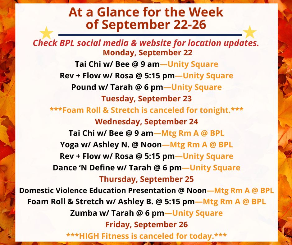 Health, Fitness, & Wellness At a Glance for the Week of September 22-26