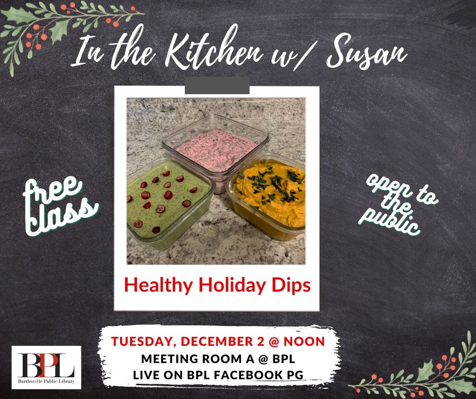 Join us Tuesday, December 2 at noon for a fun and tasty healthy-cooking class with Susan Miller! She’ll be showing us how to whip up some amazing healthy holiday dips, including: