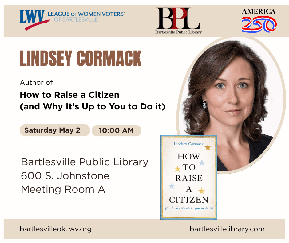 Author Lindsey Cormack will speak about her new book “How to Raise a Citizen (and Why It’s Up to You to Do It)” at 10:00 AM. Cormack holds a PhD in Government from New York University and is an associate professor of political science at Stevens Institute of Technology in Hoboken, New Jersey.